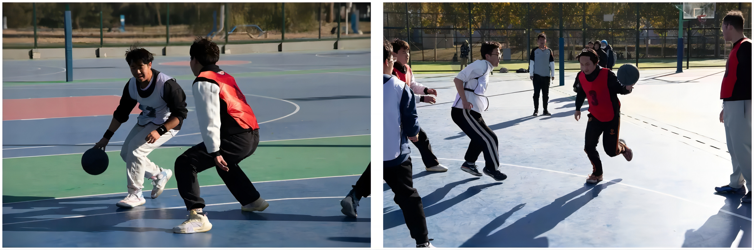 次节比赛继续,双方渐入佳境。眼神交流,手势示意,运球,转身,跳投。教师队凭借出色的团队配合不断传切篮下,上篮取分。学生队运用精准的投射与篮下高度保持着比分的领先。